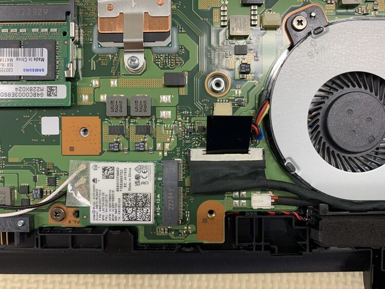 パソコンの上半身を外すために基盤に繋がっている液晶のケーブルのコネクタなどを外します。