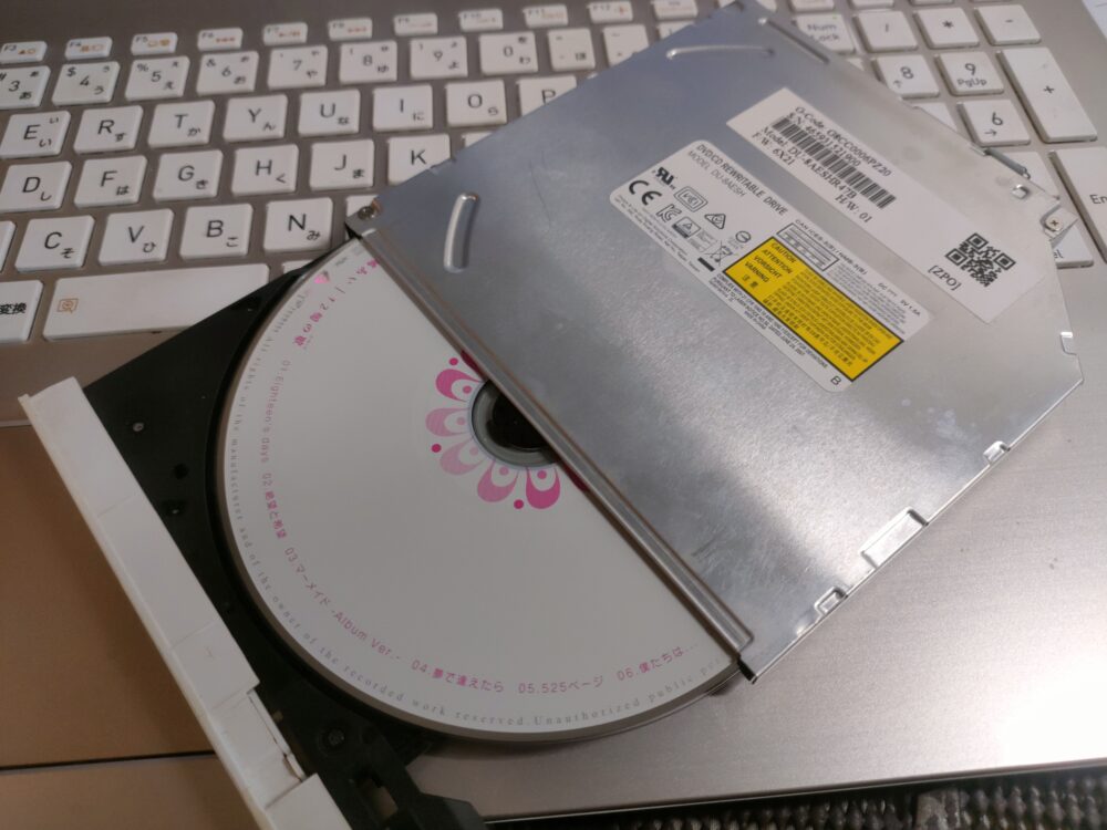 早速、 本体からDVD ドライブを取り外し。中に入っていた音楽 CD を傷つけることなく救出することができました。