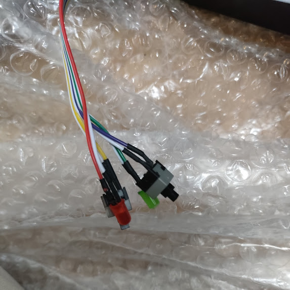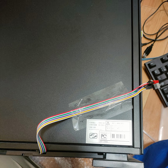 配線からマザーボードをたどって行き接点を確認、そこから電源、リセット、 電源LED、ディスクLEDをケースの外に配線しました。今後の電源オンオフはこのスイッチを使って行います。