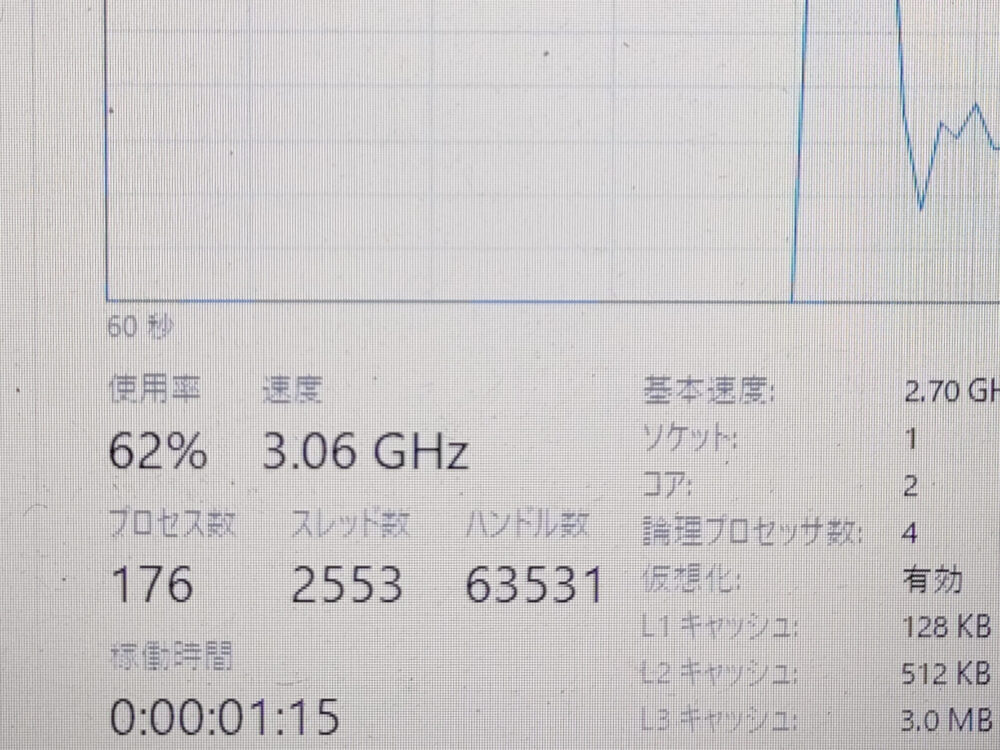 実機を確認したところ お客様のおっしゃる通り パソコンの速度が異常に遅いことが目視できました。念のため OSのパフォーマンス グラフを確認したところ CPU 速度は 半減していました。
