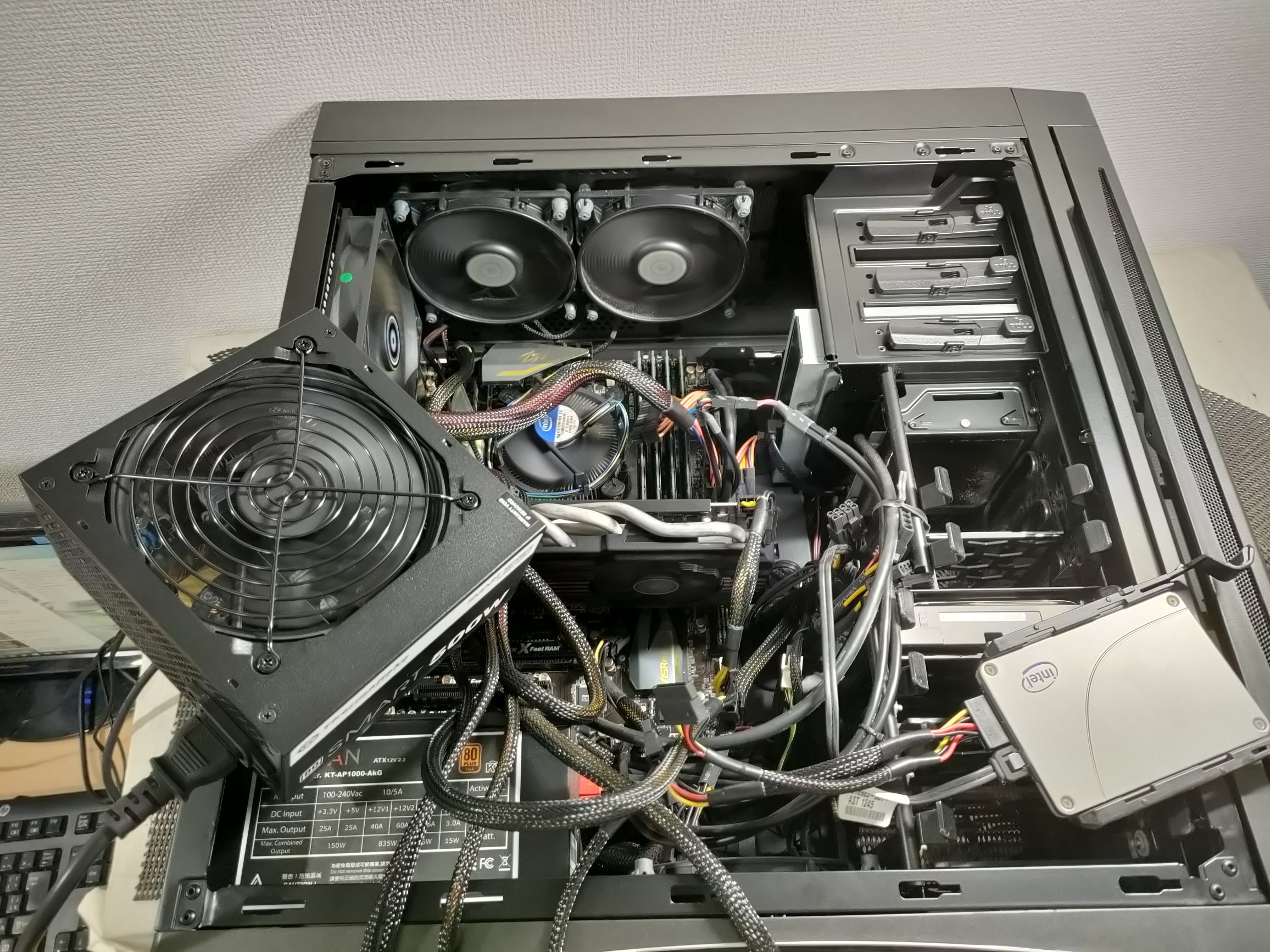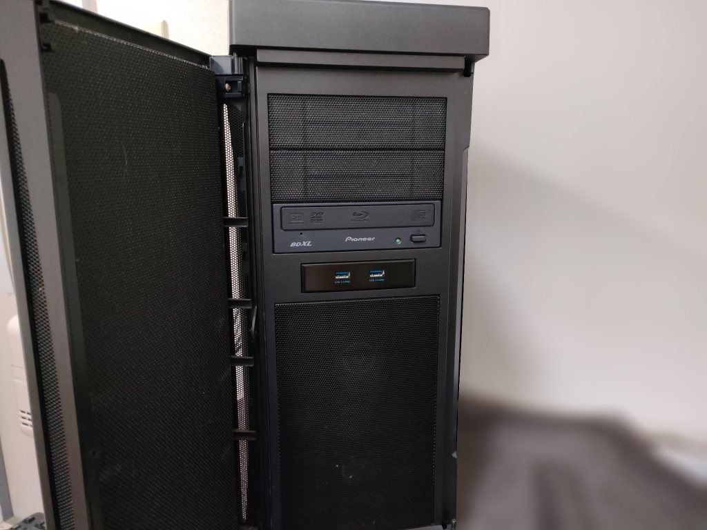 今回 、お客様のパソコンは自作機でケースの底から空気を多く吸い込む仕様でした。一番 厚くホコリが積もっていたのもこの部分で、電源ユニット もここから空気を吸引。また、ゲーミング PC として組み立てたため 大きなファンが多数 ついてます。